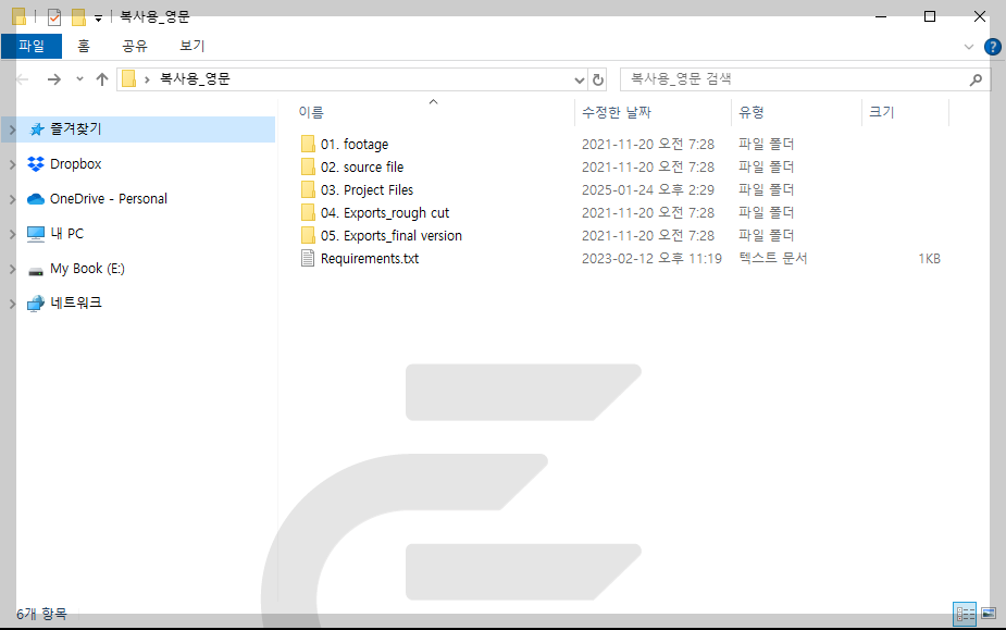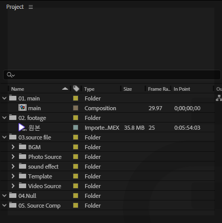 - 하위 폴더: Ae, Pr 폴더 생성 후 빈 프로젝트파일 넣을 것 - Exports_Rough Cut: 가편집 출력본