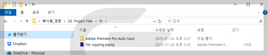 - 고정적 편집하는 경우에는 인트로, 아웃트로, 자주 쓰는 효과음, BGM을 폴더 소스에 미리 넣어두고 프로젝트 파일 안에 미리 넣어 두고 폴더 전체 복사 후 따로 관리합니다.