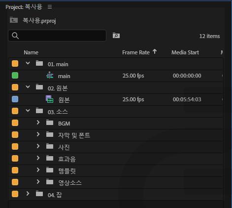 - 고정적 편집하는 경우에는 인트로, 아웃트로, 자주 쓰는 효과음, BGM을 폴더 소스에 미리 넣어두고 프로젝트 파일 안에 미리 넣어 두고 폴더 전체 복사 후 따로 관리합니다.