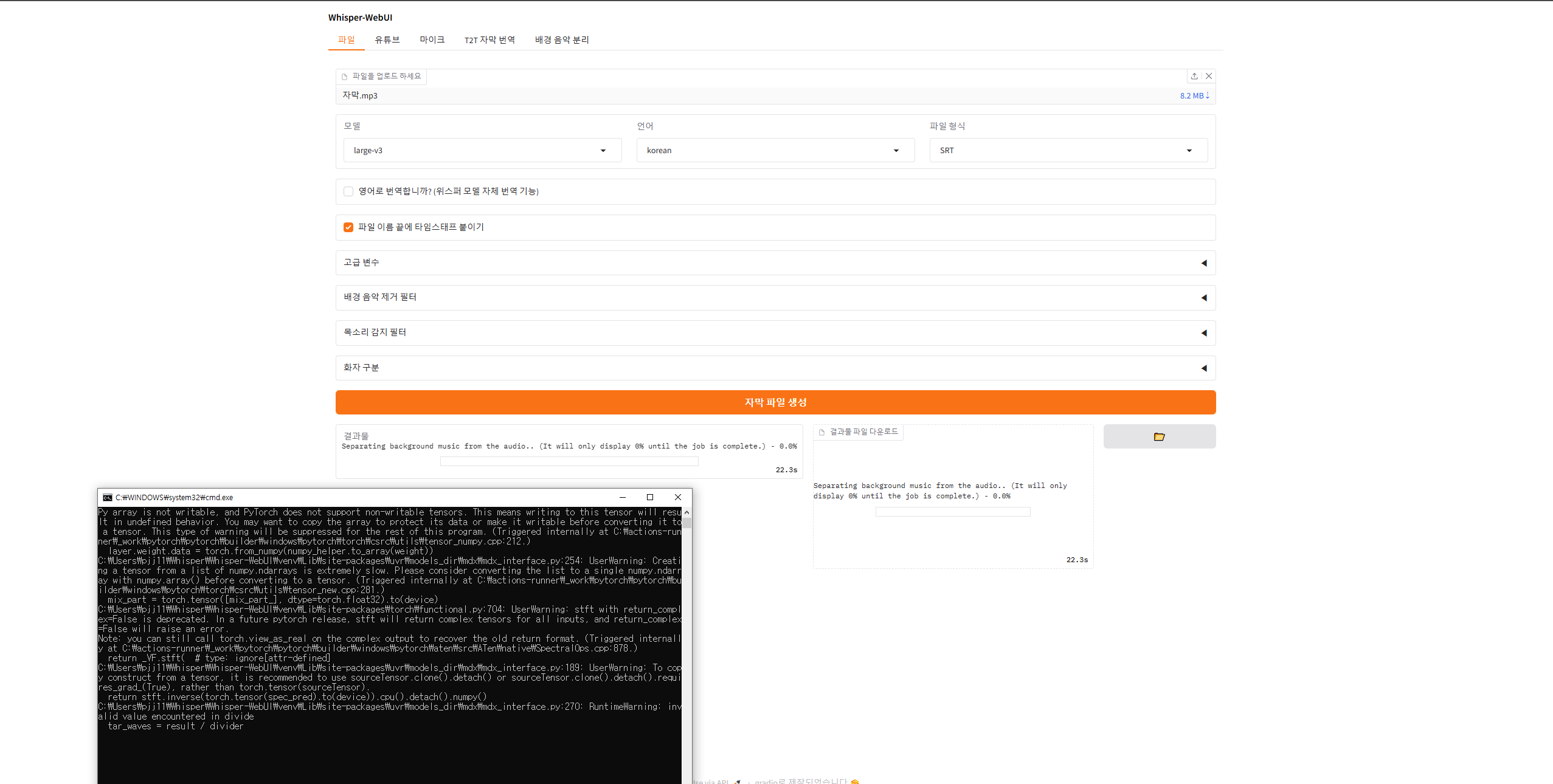 - MP3 파일을 추출한 뒤, Whisper를 이용해 SRT 파일 생성